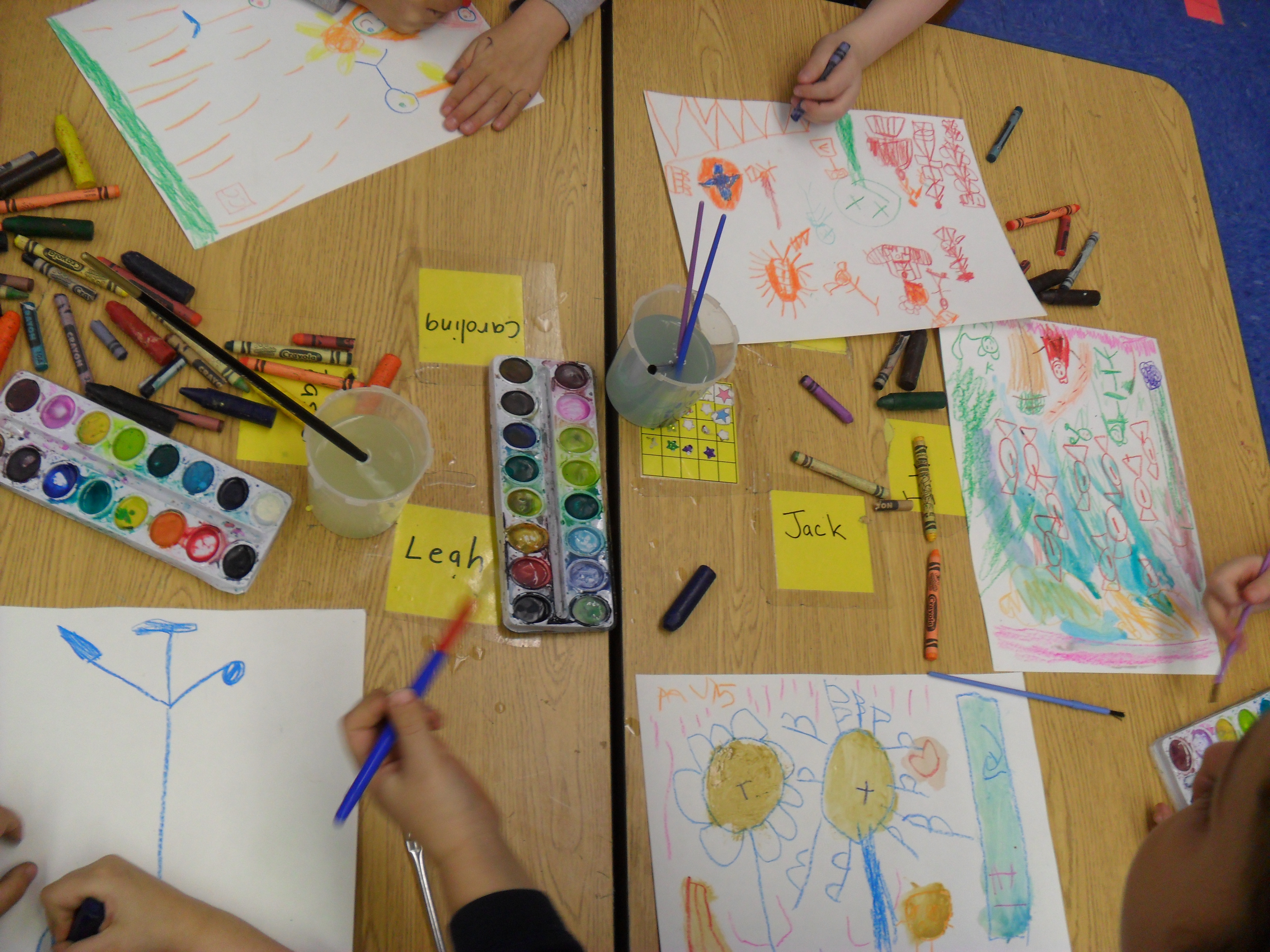 We looked at Monet and his Gardens. Then we flipped through Elmers adventure and realized that there are many ways to draw a garden. Ours were gardens full of our favorite things, and anything else we could think of. One boy make a garden that grew fish!