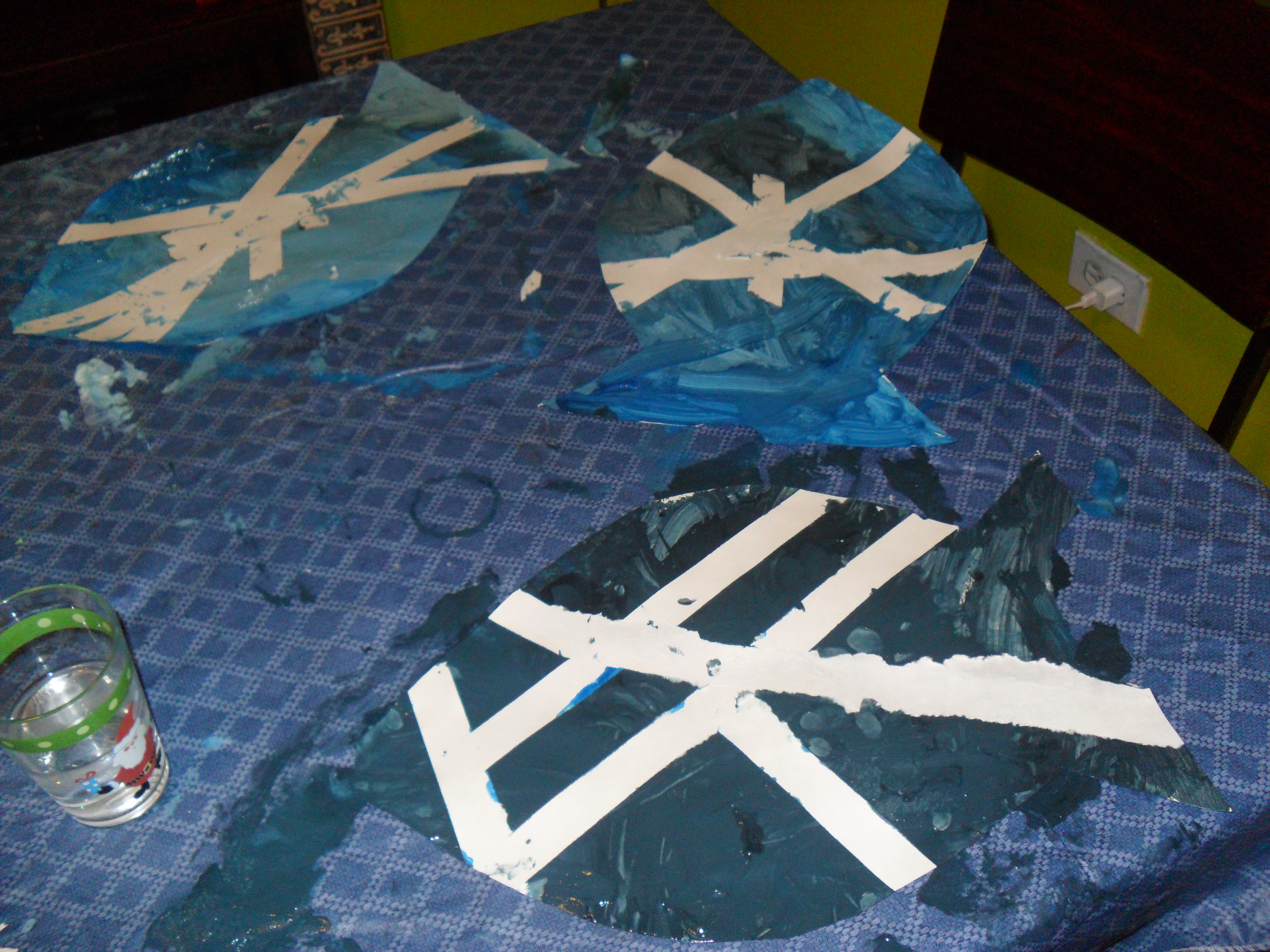 After reading Yeh-Shen: A Cinderella Story from China by Ai-Ling Louie, we created our own magical fish. Using a technique where we used tape to make a pattern then painted over it, then peeled it up, we created very simple and very dynamic paintings that looked very Bauhaus, indeed.