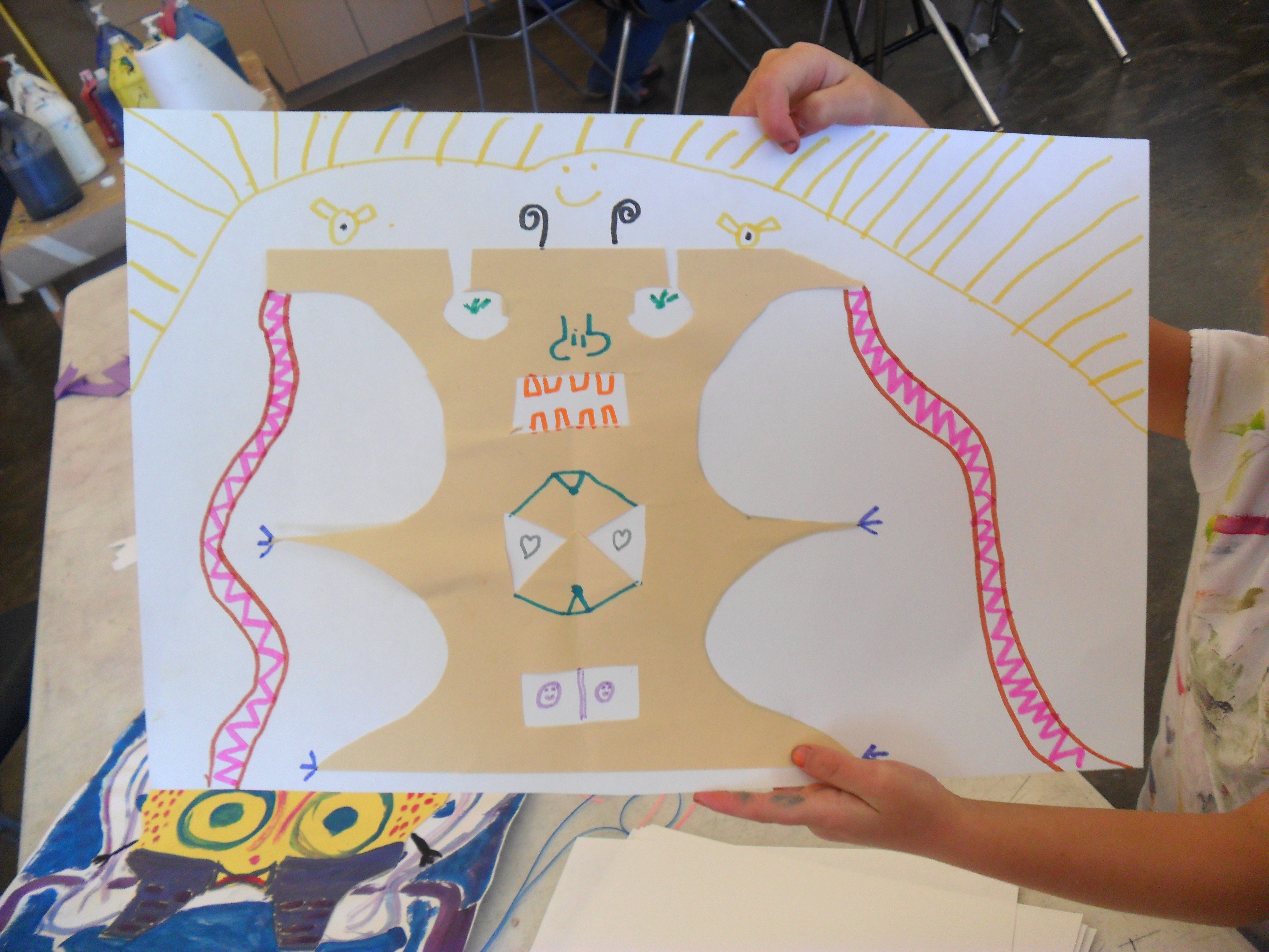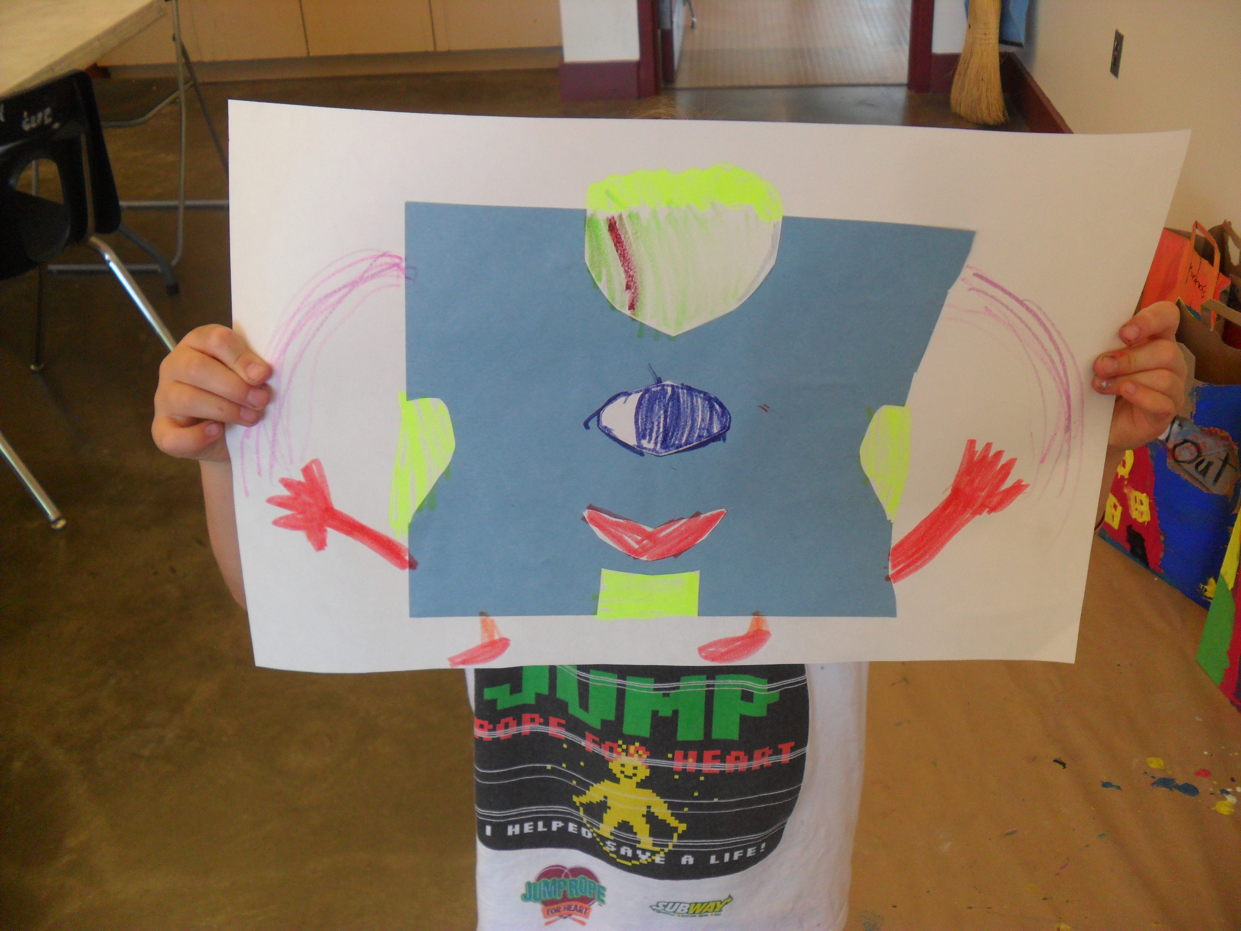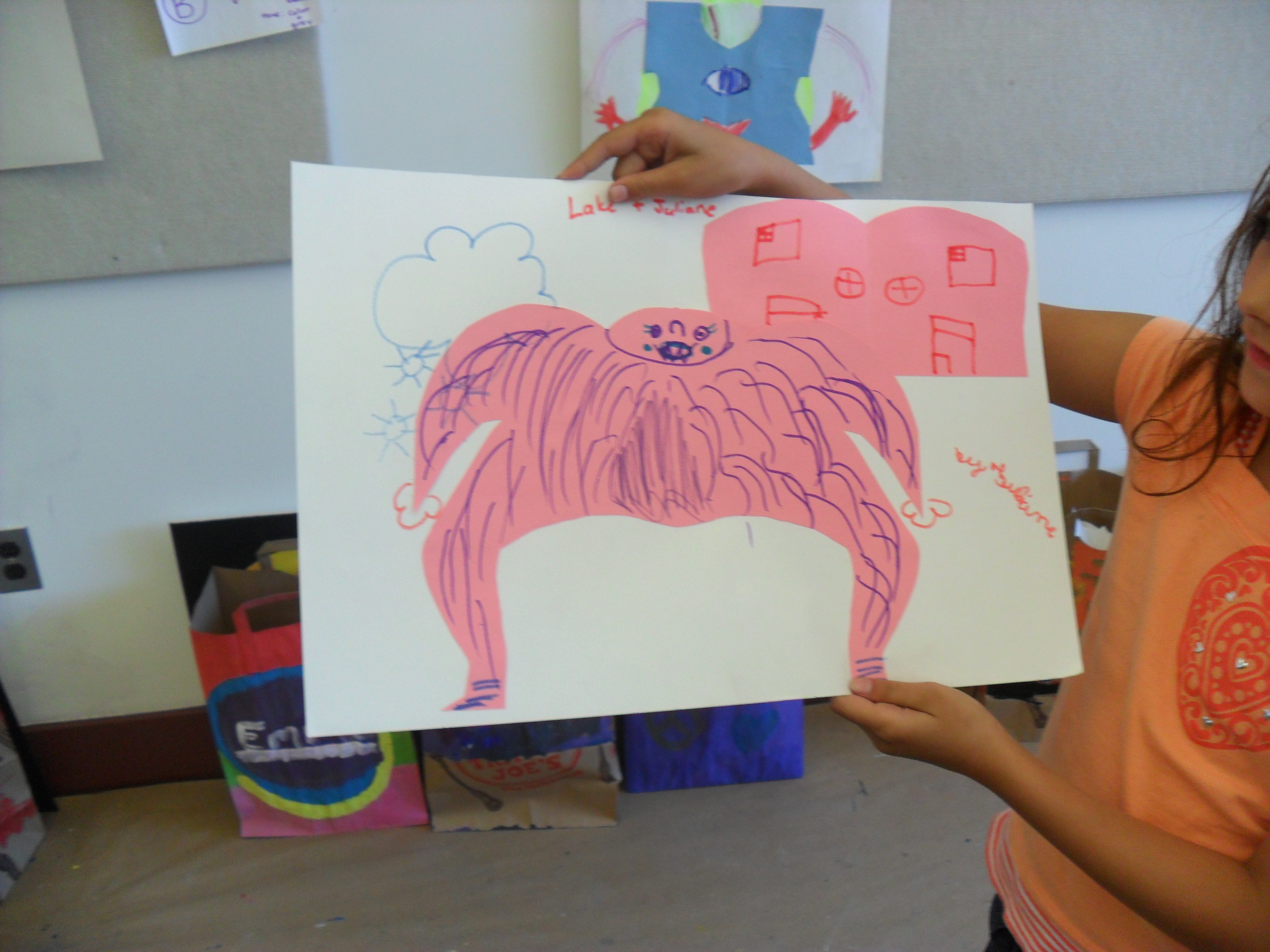 To learn more about Frida Kahlo and her artwork we read a childrens book (a bit on the sad side) about her life: Frida, by Jonah Winter and Ana Juan. It explains the story of Frida’s life and why she became a painter. The children actually loved it and inspired by the small creatures that follow Frida around in all of the illustrations and her imaginary friend in the story I asked my campers to create their own imaginary friends, using single sheets of construction paper that they had previously folded in half and cut randomly. I had them do this prior to the introduction of the assignment. Once these organic shapes had been glued down they set to work with markers. This project was an excellent way to fill in the final hour of our Wednesday afternoon.