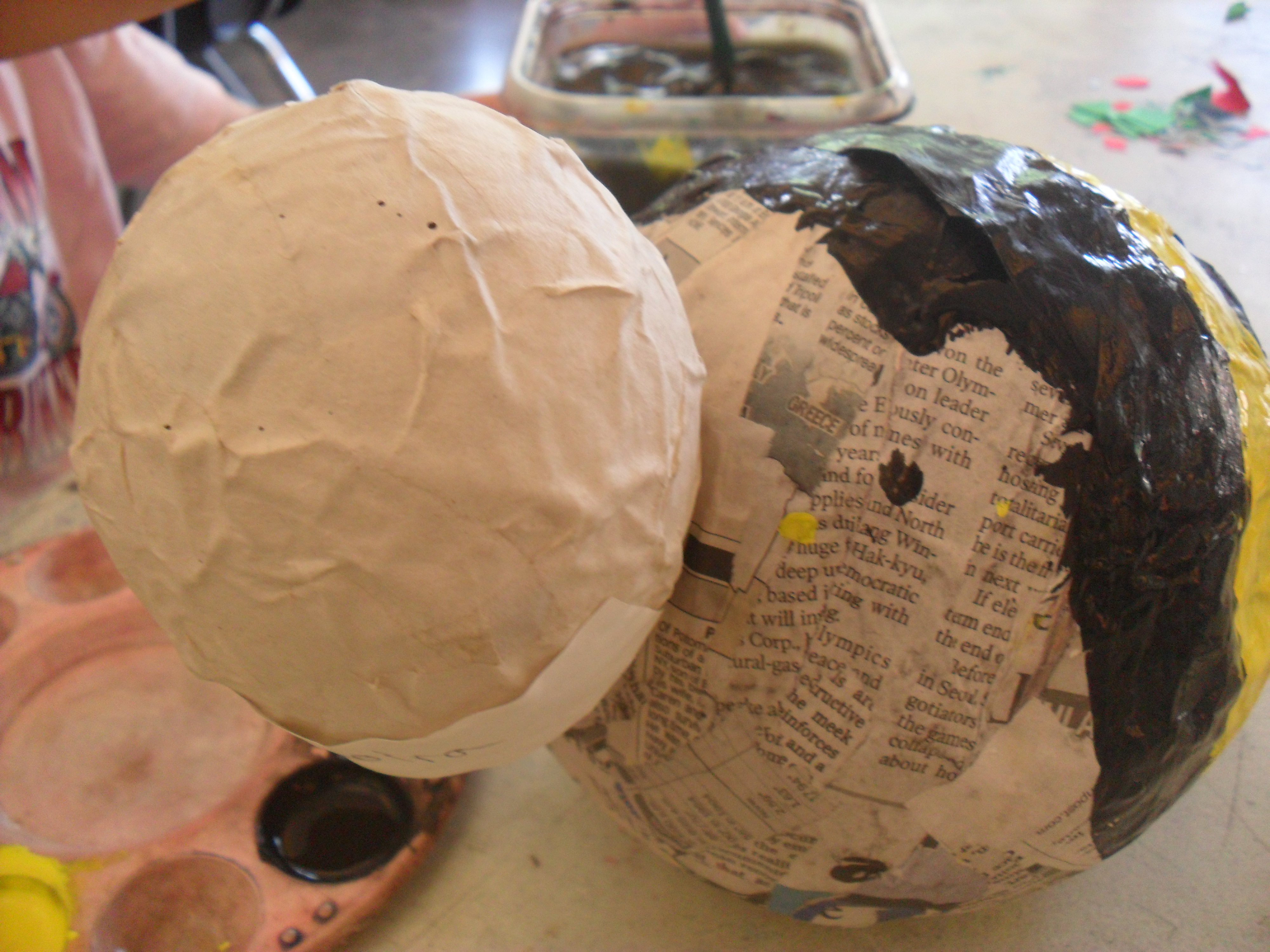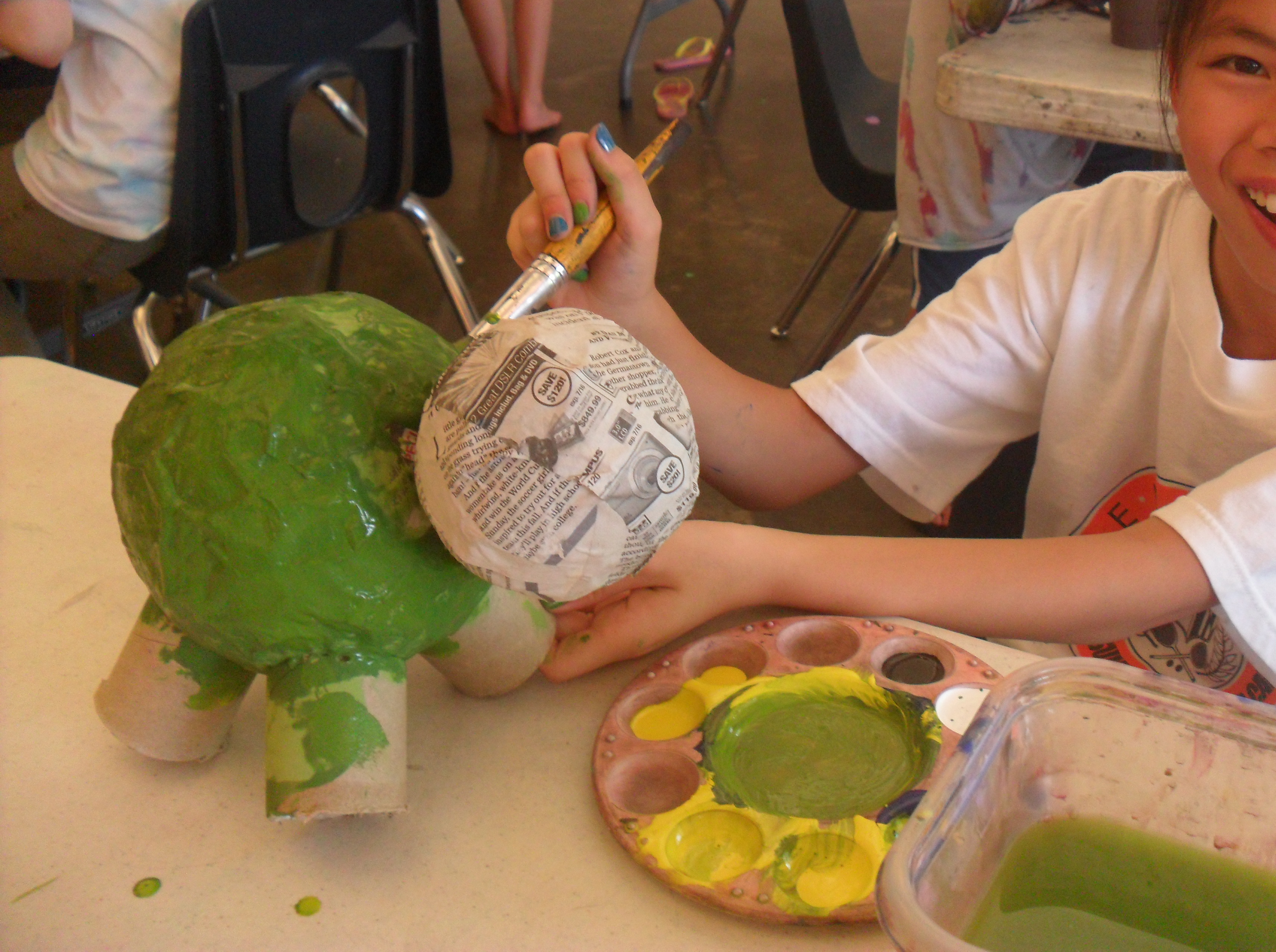 After we have let our papier-mâché dry it is time to paint it. With a little help from our 15 year-old counselors (pictures not available) we glue on extra cardboard bits to make legs and arms and noses and propellers or whatever is needed.